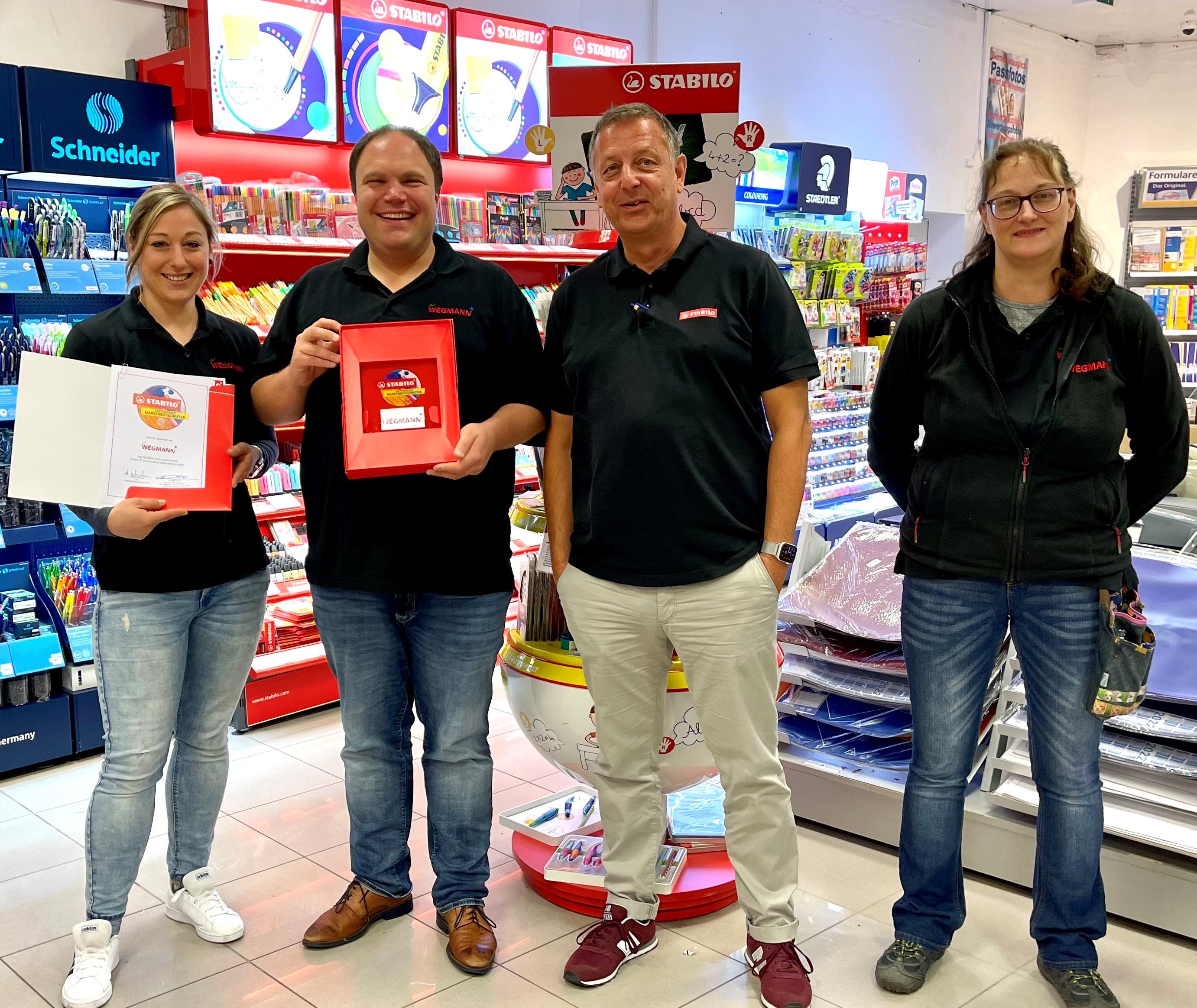 Zwiesel. Der Nürnberger Schreibgerätehersteller STABILO hat vor einem knappen Jahr sein erfolgreiches Markenbotschafter Konzept vom stationären Handel auch auf den E-Commerce ausgeweitet. Die Firma Wegmann aus Zwiesel ist nun der erste Händler in Süddeutschland, der die strengen Anforderungen vollständig erfüllt und in das Programm aufgenommen wurde. Im Rahmen einer feierlichen Übergabe überreichte Christian Strazicky, seit über 30 Jahren in dritter Generation bei der Firma STABILO und der verantwortliche Außendienstmitarbeiter den Pokal sowie die Urkunde an die Firma Wegmann. Die Markenbotschafter-Idee soll auch mit einem E-Commerce-Händler auf Leistungen und Gegenleistungen beruhen und für beide Seiten einen Mehrwert schaffen, wie Julia Nitz, E-Commerce-Verantwortliche bei STABILO, erklärt: „Der gesamte Online-Handel hat stark an Bedeutung zugelegt. Daher war es für uns naheliegend und wichtig diesen Schritt jetzt zu gehen.“ Ein wesentlicher Vorteil für den Onlinehandel sei dabei die Autorisierung durch STABILO, gibt das Unternehmen an, was Vertrauen beim Online-Endkunden schaffen und bei der Hebung der Umsatzpotentiale unterstützen soll. Gemeinsam mit dem Handel hat STABILO 12 Zielpunkte des Konzeptes erarbeitet, die unter anderen die Verbesserung der Sichtbarkeit von Onlineshops sowie einen nachhaltigen Ausbau der Markenkontaktpunkte auf den Shopseiten umfasst. Wichtig ist beiden Partnern dabei auch, dass Händler wie die Firma Wegmann zusätzlich einen lokalen Verkauf betreiben. Der Kunde kann so die Produkte von STABILO weiterhin auch vor Ort mit Beratung durch ein geschultes Fachpersonal und der Möglichkeit die Stifte auszuprobieren erwerben. Janos Metz, Inhaber des Kaufhauses Wegmann zeigt sich erleichtert: „Wir haben über sechs Monate intensiv an dem Projekt gearbeitet, um all die hohen Voraussetzungen erfüllen zu können. In der Zeit ist mit der Firma STABILO eine richtig intensive und freundschaftliche Zusammenarbeit entstanden. Umso mehr freuen wir uns jetzt, das interne Audit bestanden zu haben und als erstes Unternehmen Süddeutschlands zertifizierter E-Commerce Markenbotschafter zu sein.“ Kunden können jetzt beim Kauf von STABILO Produkten auf den großen Marktplätzen aber auch auf der Homepage der Firma Wegmann durch ein vom TÜV erstelltes Zertifikat erkennen, dass es sich um einen vertrauenswürdigen Händler handelt, der Original STABILO Ware verkauft. Aber auch offline funktioniert die Zusammenarbeit sehr gut: Am vergangenen verkaufsoffenen Sonntag fand eine große Aktion statt, bei der die Kunden an einer STABILO Maschine individuelle point 88 Stifte-Sets selbst vor Ort herstellen konnten.