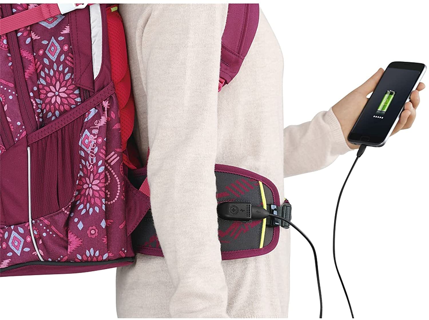 - ENERGIE-TO-GO - In einem Fach im Hüftgurt verbirgt sich ein leistungsstarker Power Pack. Das Smartphone wird einfach an der Ladebuchse auf der Außenseite angesteckt und lässt sich so auch während des Ladens bedienen.