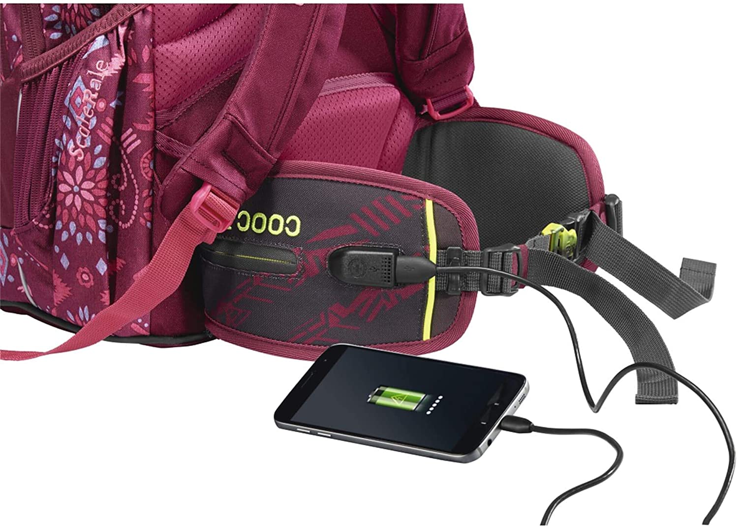 Der Bauchgurt der coocazoo TecCheck-Serie verfügt über einen integrierten USB-Ladeport: Daran lässt sich das Handy per Ladekabel anschließen und mit einem Akkupack im Reißverschlussfach des Hüftgurts verbinden. So muss das Smartphone nicht im Rucksack verschwinden, während es per Power Pack aufgeladen wird, sondern kann wie gewohnt in der Hosen- oder Jackentasche bleiben – jederzeit griffbereit, wenn du versuchst, dein Kind zu erreichen.