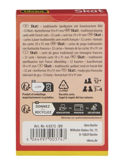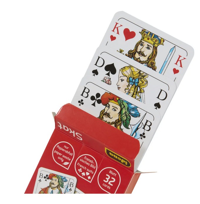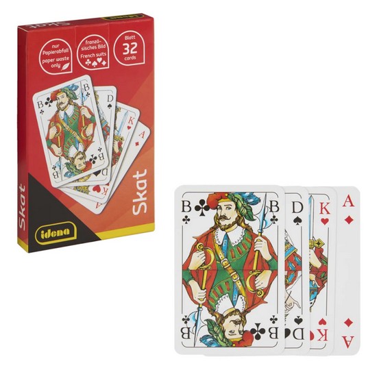 Egal ob Skat, Mau Mau, Poker oder andere beliebte Kartenspiele - mit diesem klassischen Kartenspiel, bestehend aus 32 Blatt, bist du für jede Spielrunde bestens gerüstet. Die Vielseitigkeit dieser Spielkarten ermöglicht es dir, eine Vielzahl von spannenden Spielen zu erleben und dich stundenlang zu unterhalten. Die Spielkarten sind mit einem traditionellen französischen Bild bedruckt, was ihnen einen nostalgischen Charme verleiht. Das hochwertige Design und die sorgfältige Verarbeitung machen sie zu einem absoluten Blickfang auf jedem Spieltisch. Praktischerweise sind die Karten in einem handlichen Kartonetui verpackt, sodass du sie problemlos überallhin mitnehmen kannst. Egal ob zu Hause, im Urlaub oder bei Freunden - mit diesem Kartenspiel hast du immer das perfekte Unterhaltungsprogramm zur Hand. Ein solches Skatblatt sollte in keinem Haushalt fehlen. Also schnapp dir dieses klassische Kartenspiel, fordere deine Freunde zu spannenden Spielrunden heraus und genieße gemeinsame Momente voller Spaß und Spannung. Zeige dein Können, fordere dein Glück heraus und erlebe unvergessliche Augenblicke beim Kartenspiel.