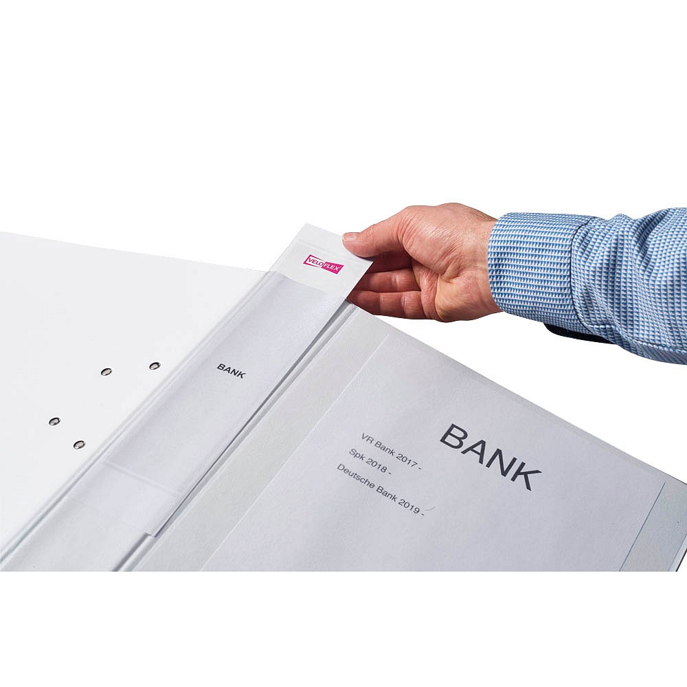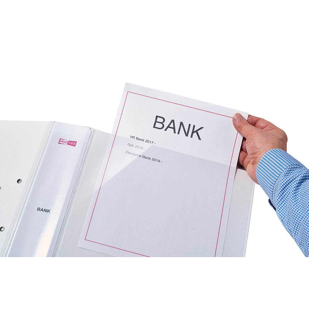 Gestalten Sie den Umschlag der VELOFLEX Präsentationsringbücher 2-Ringe ganz nach Ihren Wünschen! Schieben Sie einfach die von Ihnen individuell gestalteten Einleger in die ganzseitige Klarsichttasche auf der Vorderseite sowie in den Rücken.