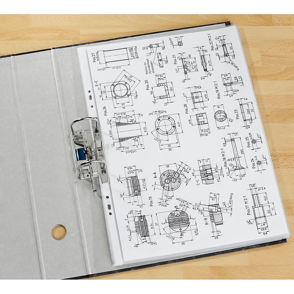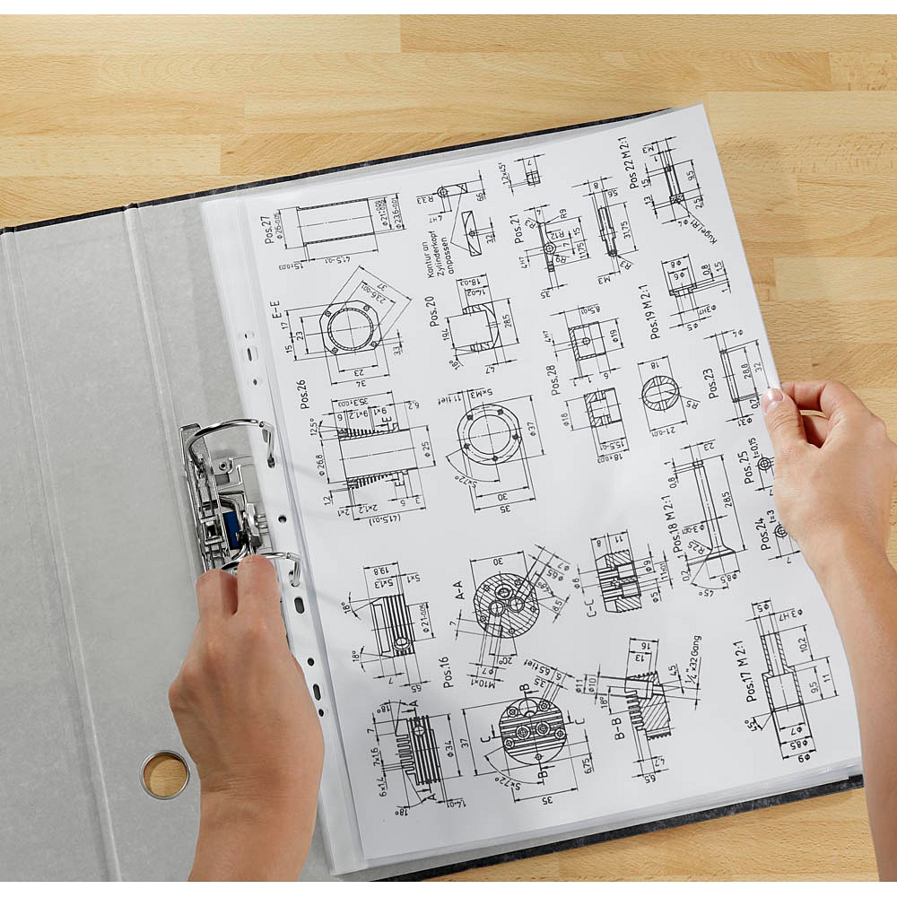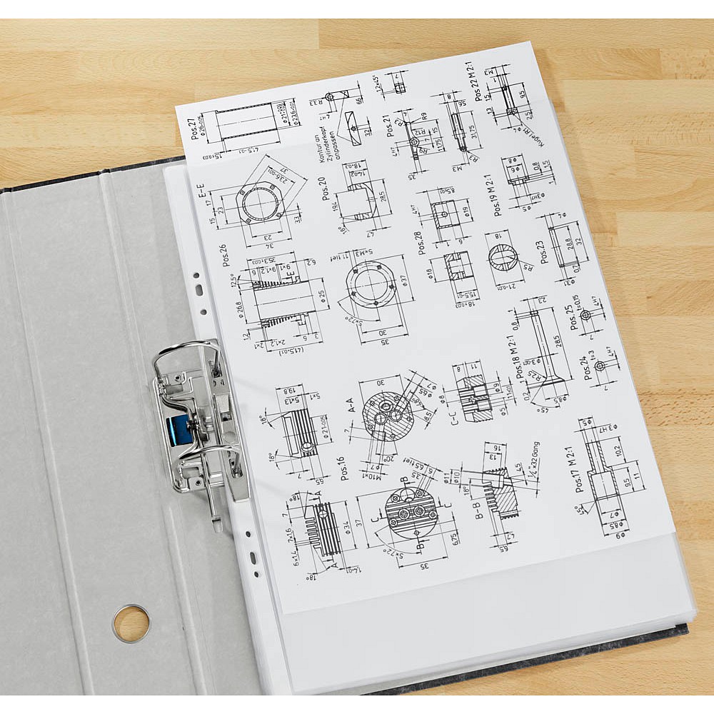 Abheften gelingt mit der Universal-Lochung spielend leicht. Die dokumentenechte Prospekthüllen sind mit Einreißschutz und einer Papiereinlage ausgestattet. Wenn auch bereits abgeheftet, lassen sich durch die Öffnung am oberen Rand Dokumente einfach einschieben oder entnehmen.