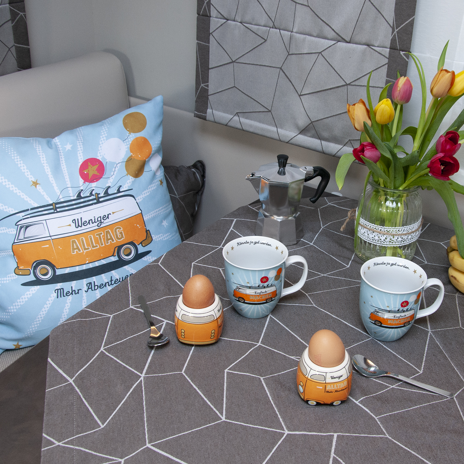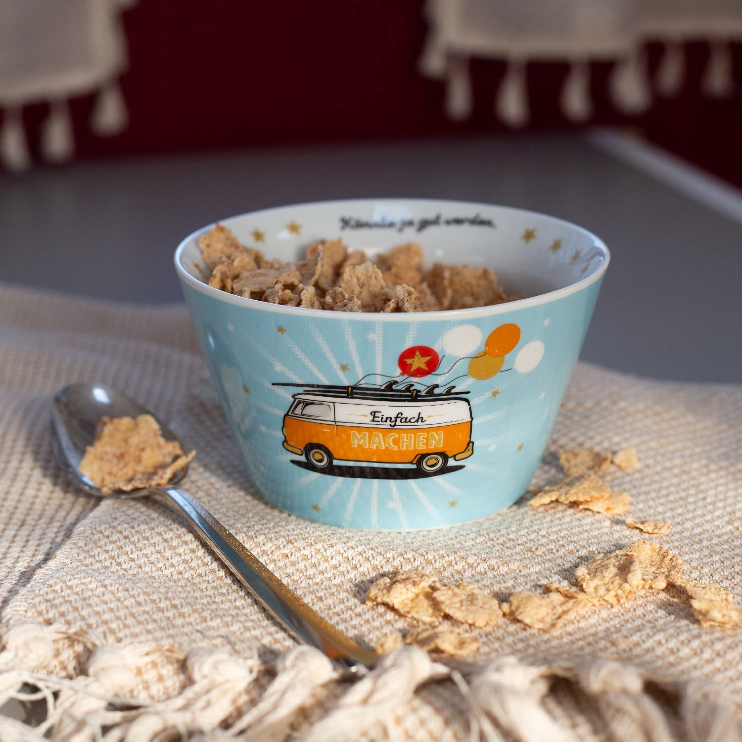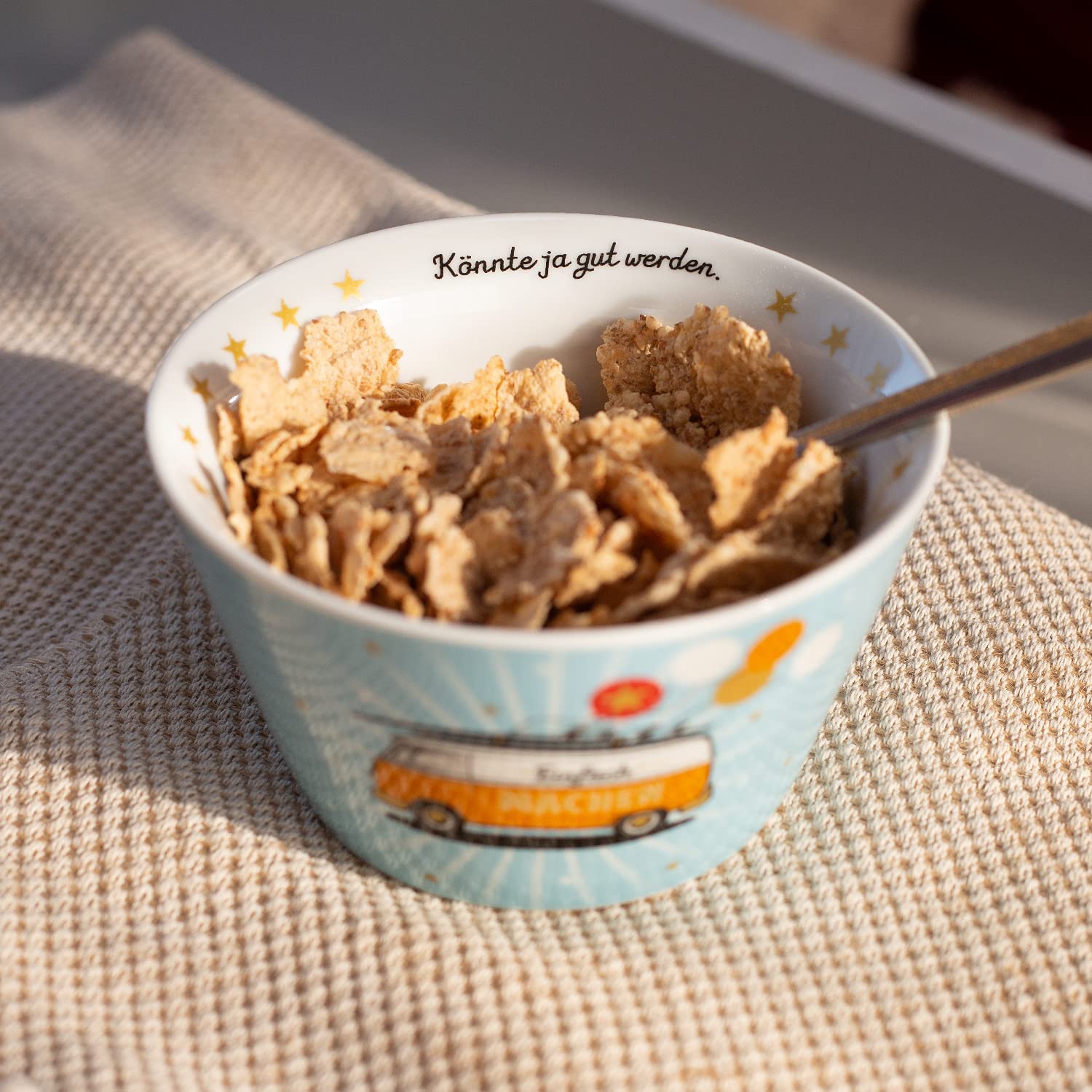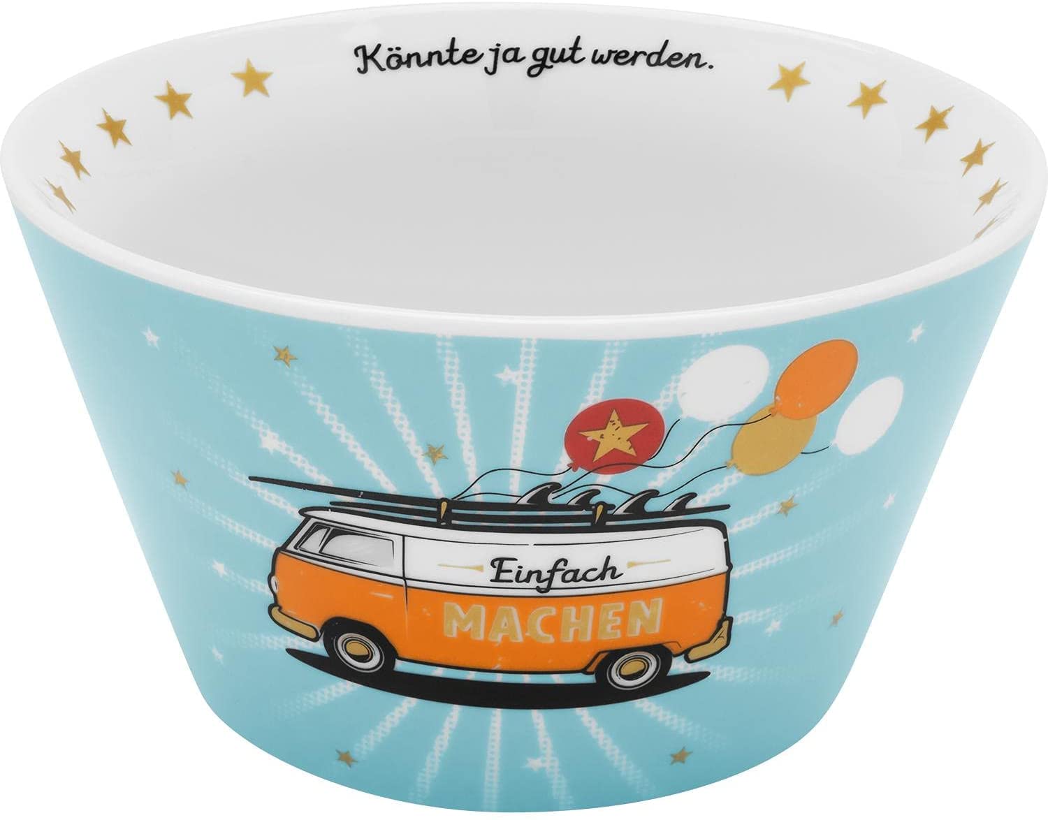 Müslischale aus Porzellan mit farbigem Bus Motivdruck und mit Golddruck veredelt, Höhe 7,8 cm, Durchmesser 13,5 cm. Schale in Blau und Orange mit Spruch 'Einfach machen. Könnte ja gut werden.' Die schöne Frühstücksschale ist mit einem farbigen Bus Motiv bedruckt und mit Golddruck veredelt. Sie trägt den witzigen Spruch 'Einfach machen. Könnte ja gut werden.' Die Schale ist pflegeleicht und praktisch; sie darf in die Spülmaschine und in die Mikrowelle. Die Müslischale eignet sich zudem gut als kleine Überraschung für einen lieben Menschen. Zum Geburtstag, oder einfach so zwischendurch.