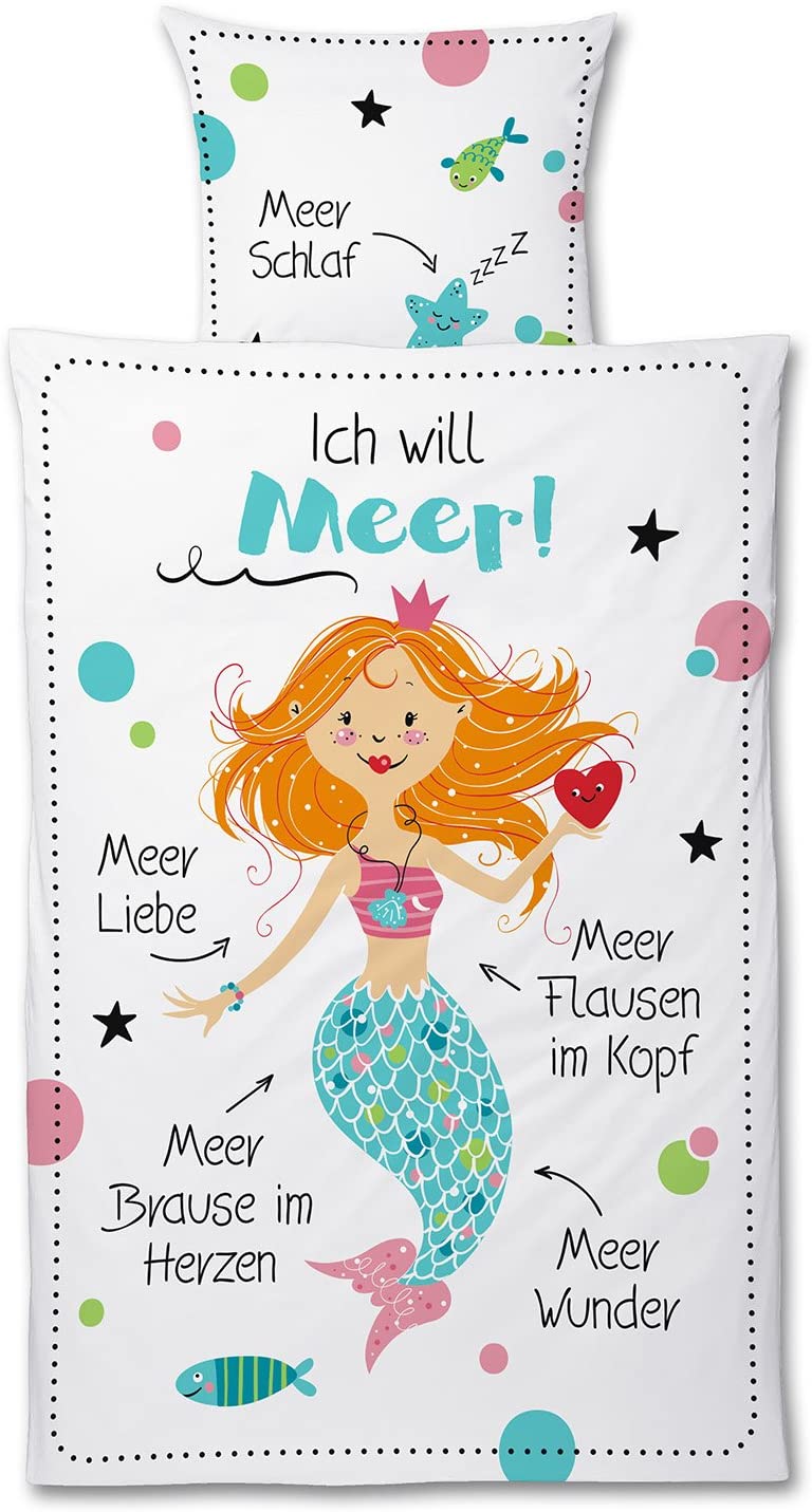 - Trendiges, maritimes Meeres-Design mit Meerjungfrau, Deckenbezug mit Spruch 'Meer Schlaf', Kissenbezug mit Spruch 'Ich will MEER! Meer Liebe Meer Brause im Herzen Meer Flausen im Kopf Meer Wunder'