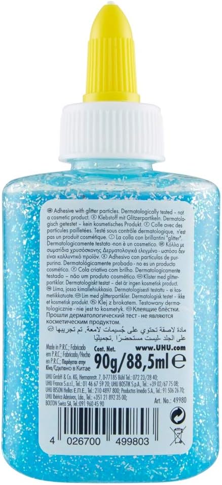 UHU Glitter Glue Blau. Ohne Lösungsmittel. Kreativer Glitzerspaß auf vielen Materialien, dermatologisch getestet, für die Herstellung von Slime geeignet. Produktverwendung: Bilder, Grußkarten, Slime. Auswaschbar