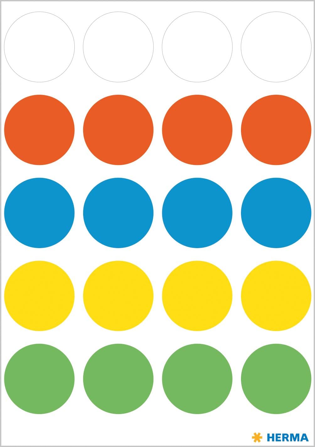 - Lieferumfang: 100 x HERMA Farbpunkte, Ø 19 mm, rund, bunt (5 Blatt je 20 Etiketten)