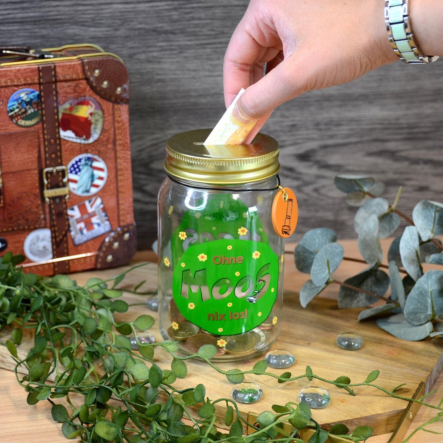 - Schöne Glas-Spardose mit Motivdruck, Spardose mit Motivdekor und Spruch 'Ohne Moos nix los'