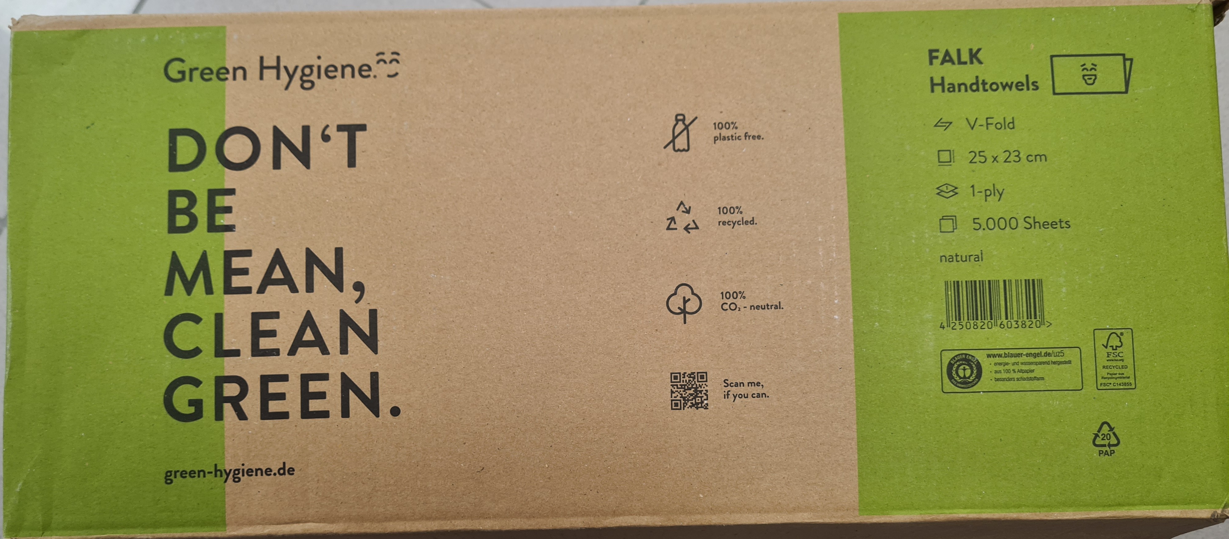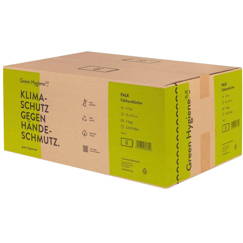 Produktinformationen "Green Hygiene FALK, Falthandtücher, V-Falz/Z-Falz, 1-lagig, 25x23cm, Recycling, natur, Blauer Engel, 20x250 Blatt, 5000 Blatt/VE, Papierhandtücher, Zi"
