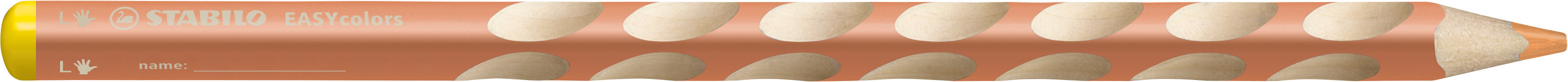 Ergonomischer Dreikant-Buntstift STABILO® EASYcolors. Ausführung der Schaftform: Dreikantform. Farbe des Schaftes: in Malfarbe. Material des Schaftes: PEFC Lindenholz. Schaft lackiert. Größe (Ø x L): 9 x 175 mm. Für Linkshänder - sichtbar durch gelben Farbcode am Stiftende. Dreikantform und rutschfeste Griffmulden für eine entspannte Handhaltung. In Holz aus nachhaltiger Waldwirtschaft. Mit Namensfeld. Stärke der Mine: 4,2 mm. Schreibfarbe der Mine: apricot. Farbe des Schaftes: in Malfarbe Stärke der Mine: 4,2 mm