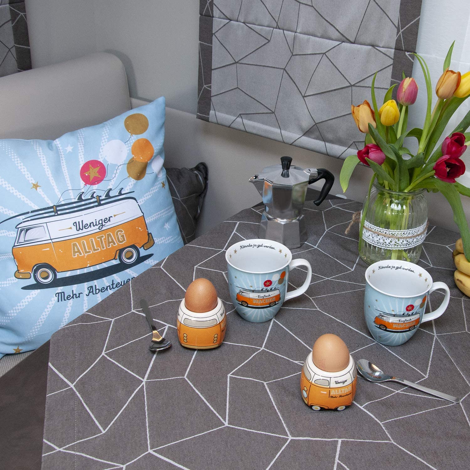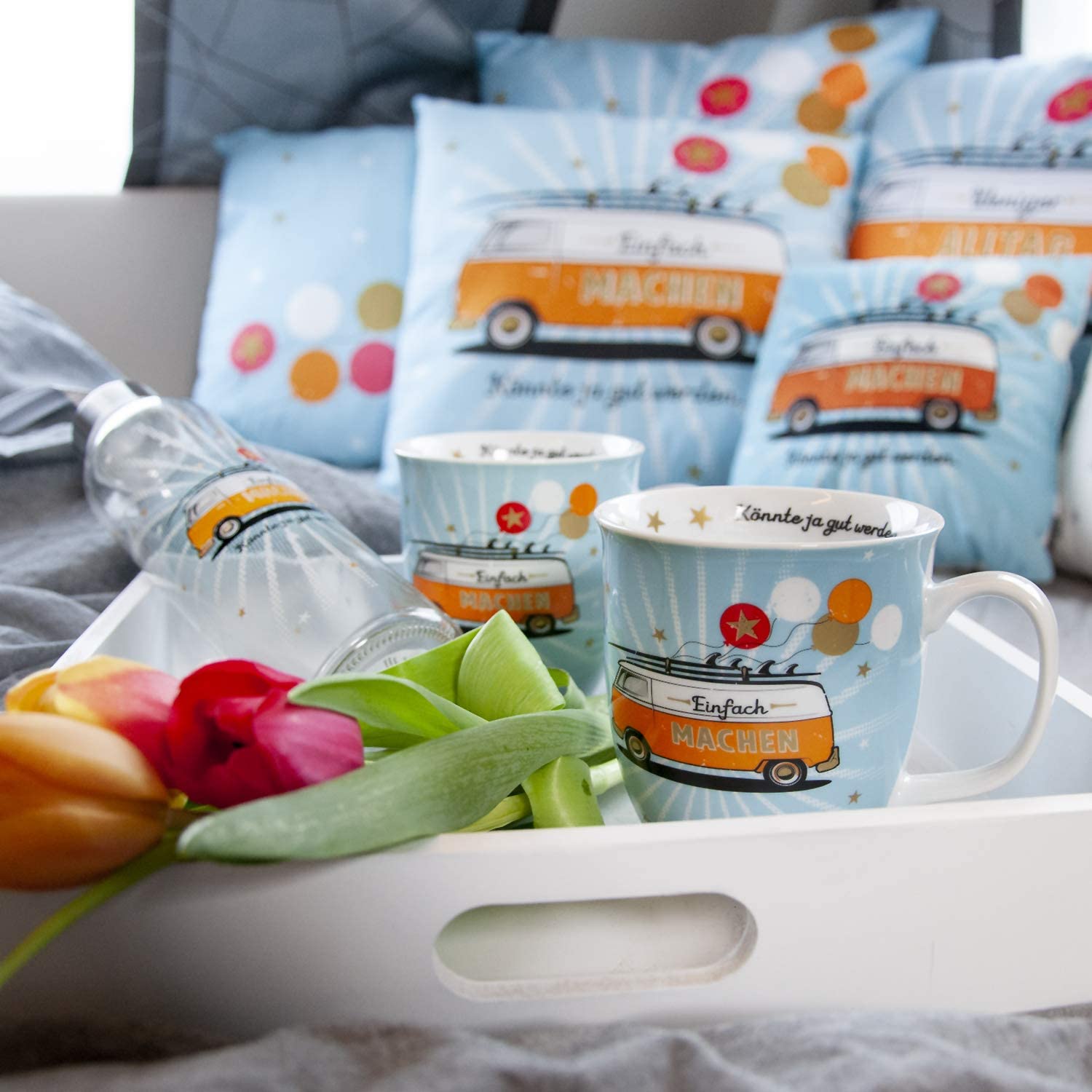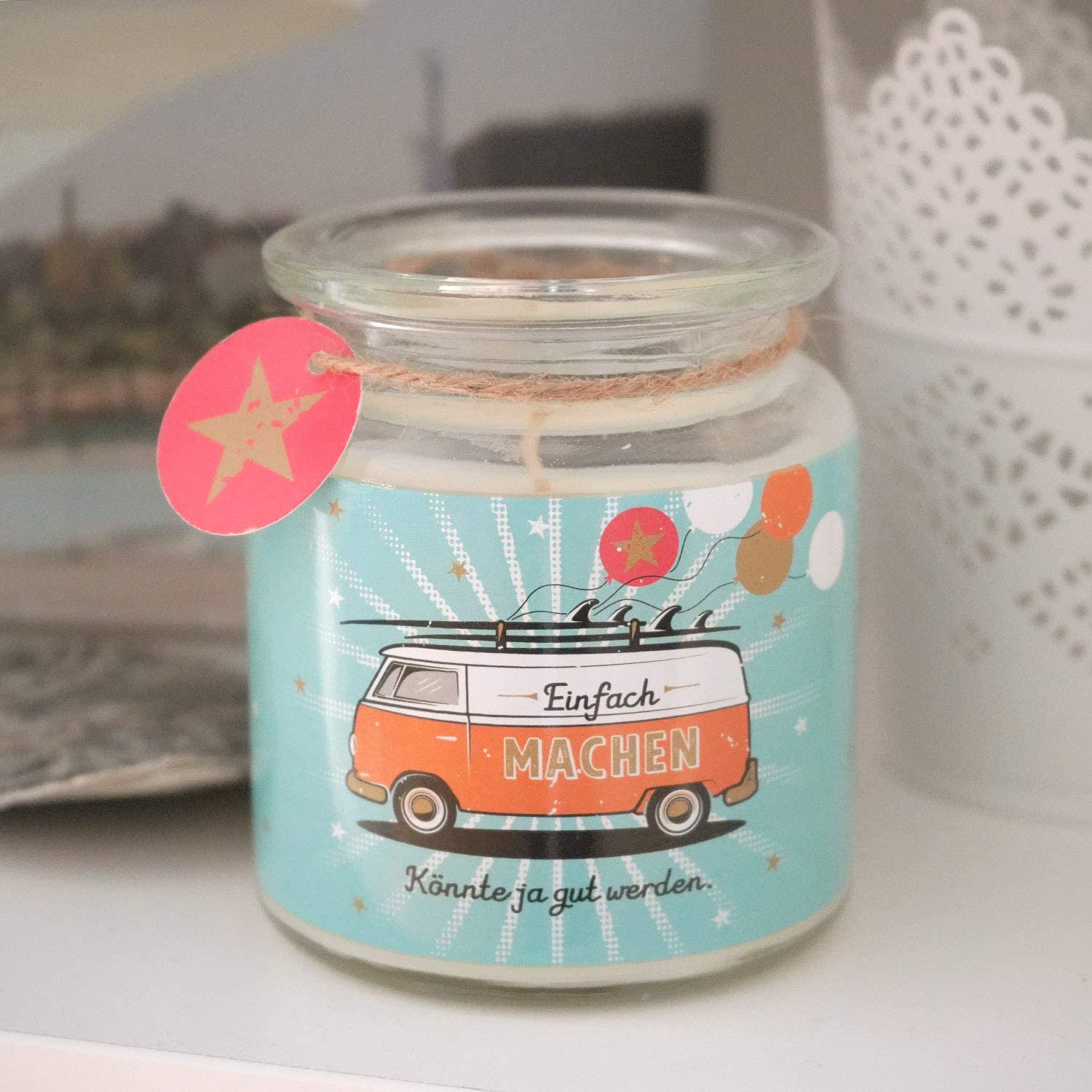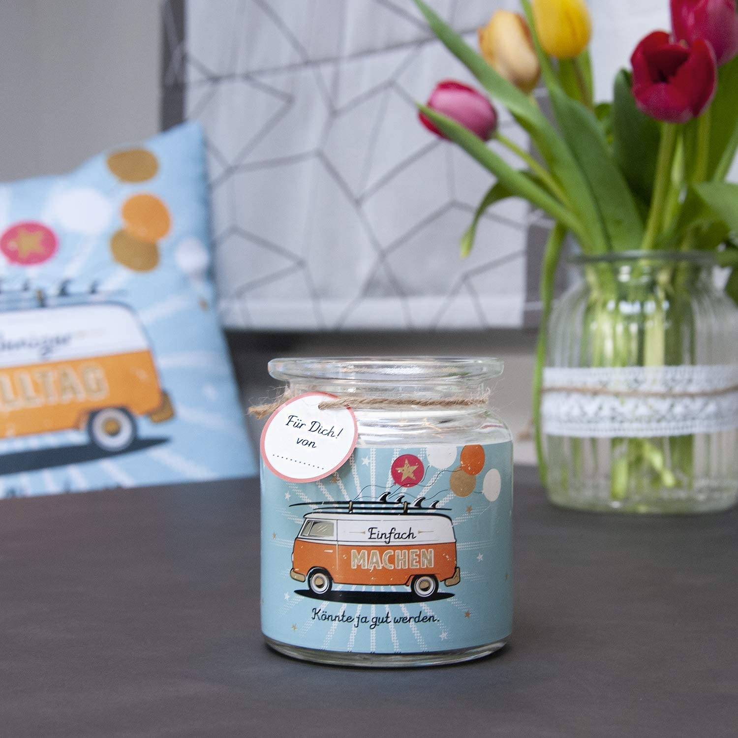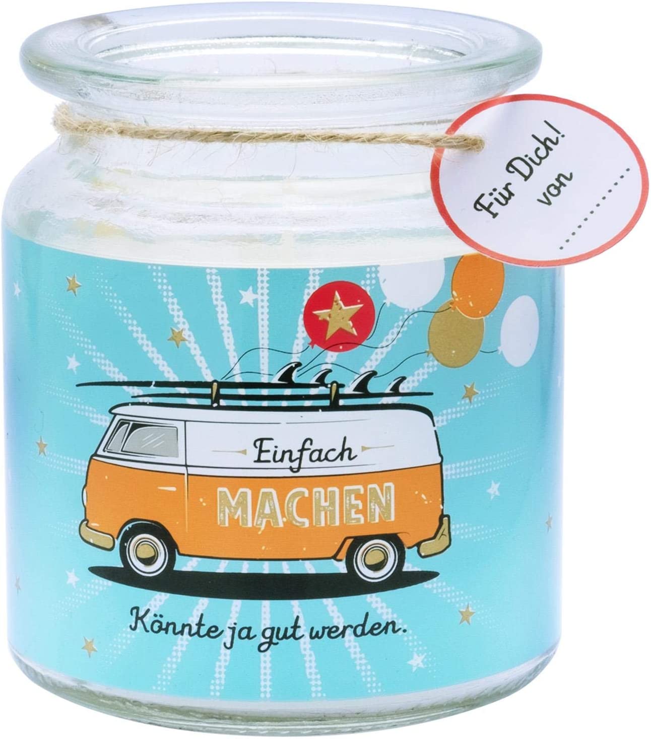 - Dekorative Kerze im Glas, bedruckt mit Bus-Motiv und Spruch „Einfach machen. Könnte ja gut werden.“