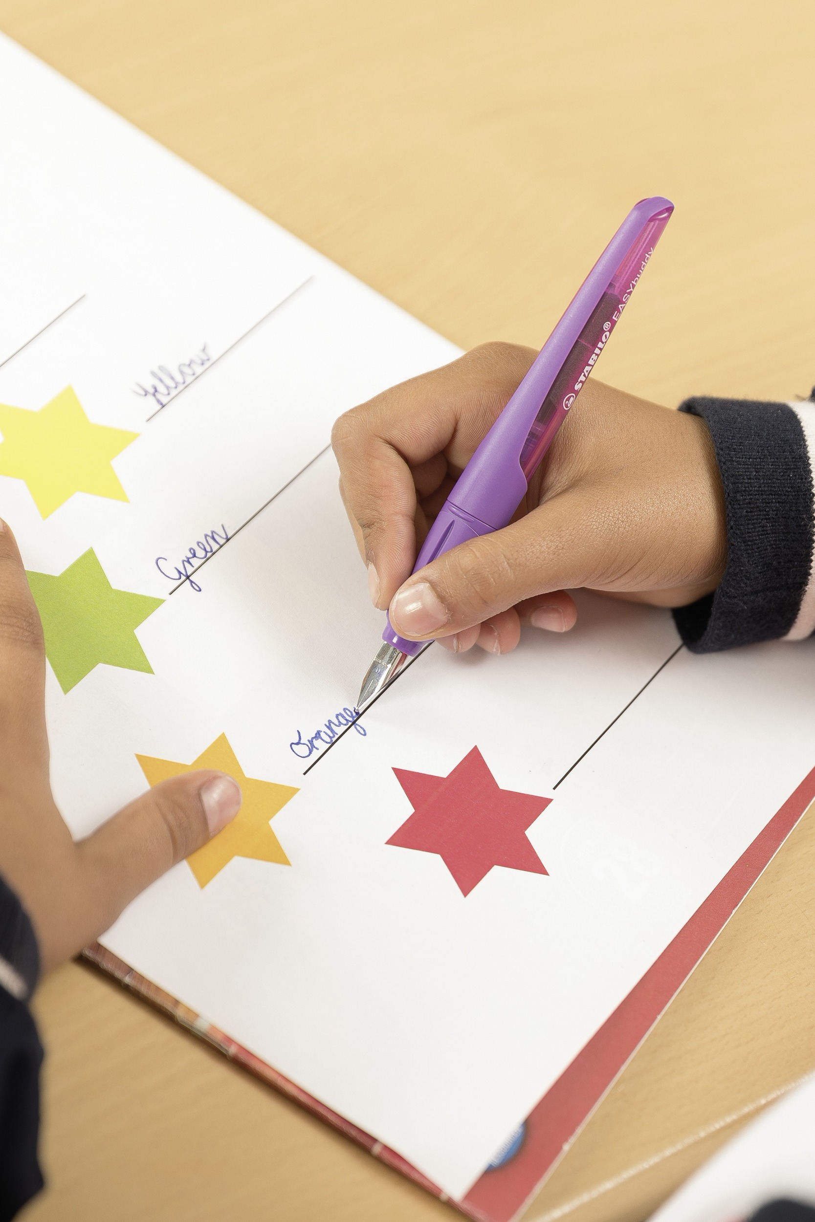 Der STABILO EASYbuddy ist der optimale Begleiter für kleine Helden und Heldinnen in der Grundschule. In ihm steckt das ganze Expertenwissen der STABILO Ergonomie-Profis, sodass ihren Kindern das Finden der richtigen Schreibtechnik einfacher fällt und sie jede Menge Spaß am Schreiben haben. Die universelle, rutschfeste Soft-Griffzone des ergonomischen Schulfüllers sorgt für sicheren Halt, was ein entspannte Stifthaltung fördert und einem frühzeitigen Ermüden der Muskulatur vorbeugt. Eine für den STABILO EASYbuddy speziell entwickelte Technologie minimiert zudem das Risiko des Auslaufens der Tinte. Die Feder mit integriertem Iridiumkorn gibt es in Varianten für Anfänger, geübtere Schreiber und Linkshänder. So kann sie entsprechend der Bedürfnisse des Kindes (Schreibdruck, Neigungswinkel, Händigkeit) ausgewählt werden, was bei einer leichten Schreibführung hilft und ein sauberes Schriftbild fördert. Nachfüllbar ist der Füller mit zwei Standardpatronen oder einer Großraumpatrone. Das extra große Sichtfenster sorgt für die leichte Kontrolle des Tintenstandes bei beiden Patronen. Ergonomische, rutschfeste Soft-Griffzone, geeignet für Links- und Rechtshänder Feder und Schaft aus robustem Material Erhältlich in 3 Feder-Varianten (Anfänger A, Standard M, Linkshänder L) Feder mit Iridiumkorn für eine leichte Schreibführung und ein sauberes Schriftbild - kleckst nicht, kratzt nicht Maximaler Auslaufschutz durch speziell entwickelte Technologie Extra großes Sichtfenster zur Kontrolle beider Patronen Erhältlich in 3 Farbkombinationen https://youtube.com/watch v=t6mqmDoCMks 0